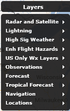 This top level menu contains a number of logical layer groupings that make it easy for you to find the weather information you are looking for more quickly and intuitively. There are multiple sub-menu items that contain logical groupings of weather layers. We will look at the contents of each of the sub-menus below.