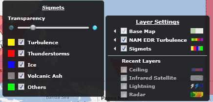 This sub-menu contains all of the High Sig Weather layers to allow users to quickly create dynamic map displays containing all required significant weather information to help determine impacts on upcoming flights. Please note that we will be adding very shortly Pressure Centers and Fronts to this menu once available |