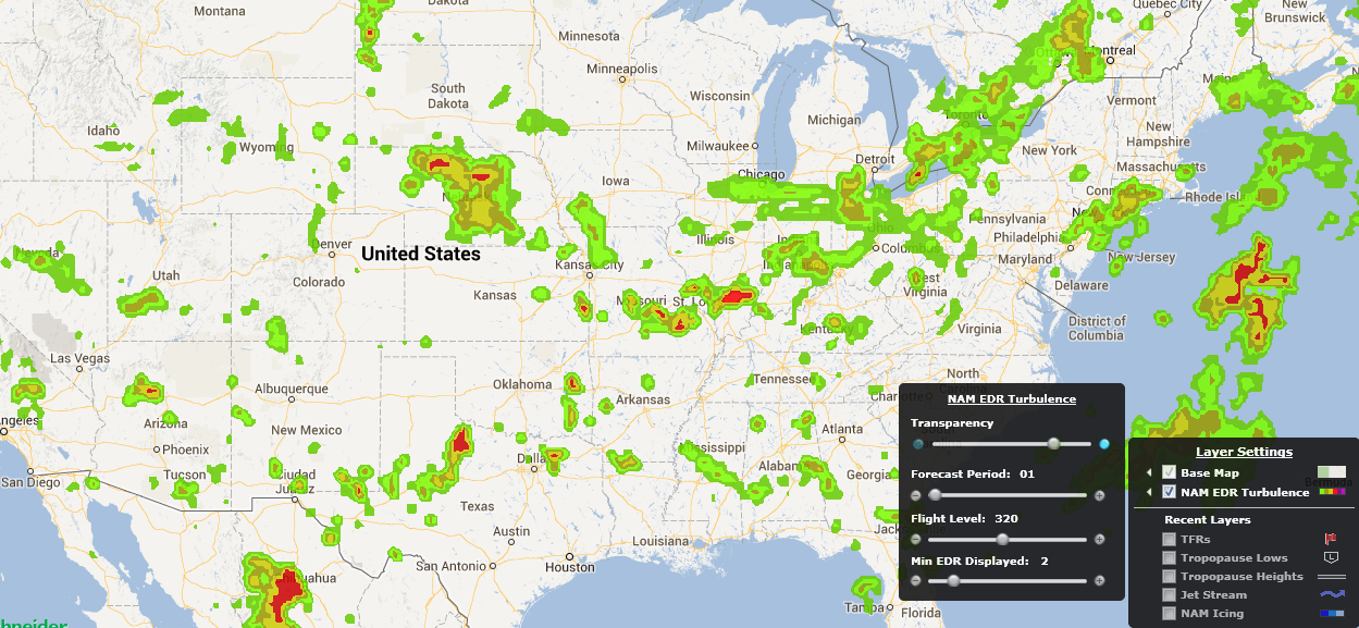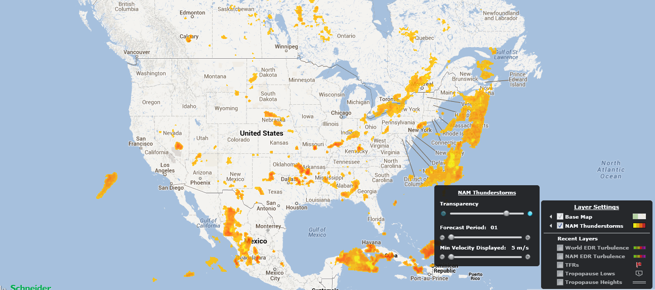 This layer provides the users with high definition forecast EDR turbulence for multiple flight levels as well as forecast periods over all of North America. The scale of EDR is from 0.1 – 1.0 (we eliminate the 0.1 and 1).