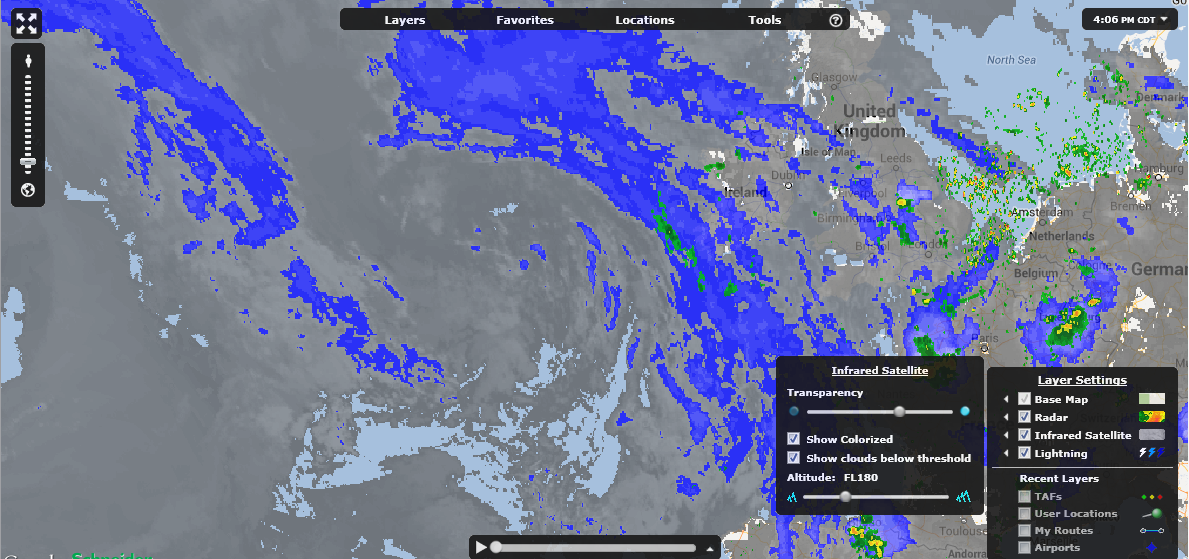 There is a new option that has been added to the Infrared Satellite layer to enhance the user experience by allowing them to remove clouds below their selected altitude. The current feature of colorizing the clouds remains the same but now by de-selecting the “Show clouds below threshold” the gray clouds will be removed. For all of our Helicopter users, no worries you are still able to show low clouds as before.