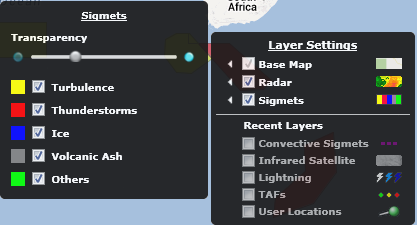 This version of AviationSentry introduces colorized Sigmets to indicate the classification of each Sigmet graphically without having to select each one on the map to view the type. We have also introduced the possibility for users to select only the types of Sigmets that they want to see on the map thus avoiding unwanted clutter. When users hover over areas where multiple Sigmets are present, ASO will now display tooltips for ALL Sigmets and not just the top most Sigmet, the tooltip text color will also match the color of the Sigmet. See the images below for the details on colors