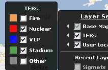 This version of AviationSentry introduces colorized TFRs to indicate the classification of each TFR graphically without having to select each one on the map to view the type. We have also introduced the possibility for users to select only the types of TFRs that they want to see on the map thus avoiding unwanted clutter.