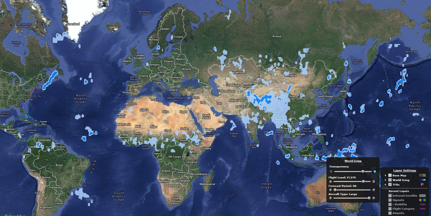 This layer provides the users with high definition forecast Icing for multiple flight levels as well as forecast periods on a global scale. There are specific forecast for Small, Medium and Large Aircrafts