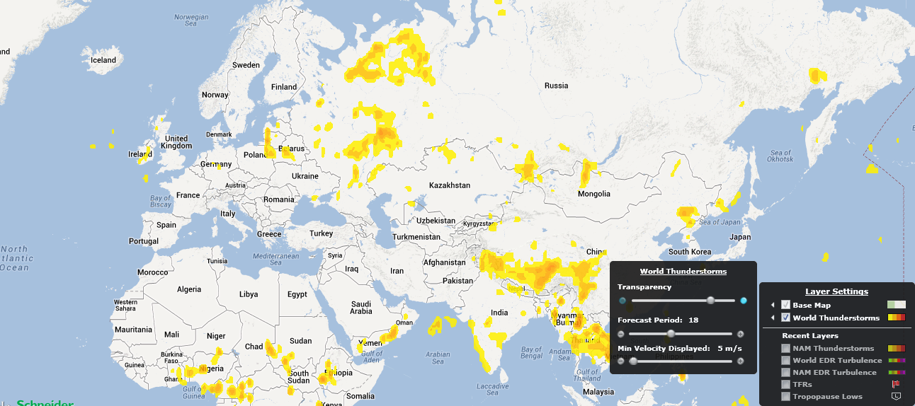 The Forecast Flight Levels available are 050,100,125,180,240,270,300,320,340,370,390,450,530 as well as combined layers LMAX (from SFC-FL240) and UMAX (From FL240-530) and are available by using the “Flight Level” slider bar in the layer options