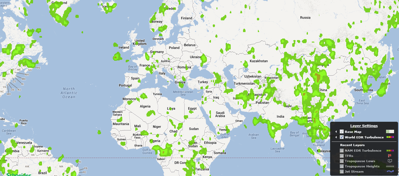 This layer provides the users with high definition forecast EDR turbulence for multiple flight levels as well as forecast periods on a global scale. The scale of EDR is from 0.1 – 1.0 (we eliminate the 0.1 and 1).