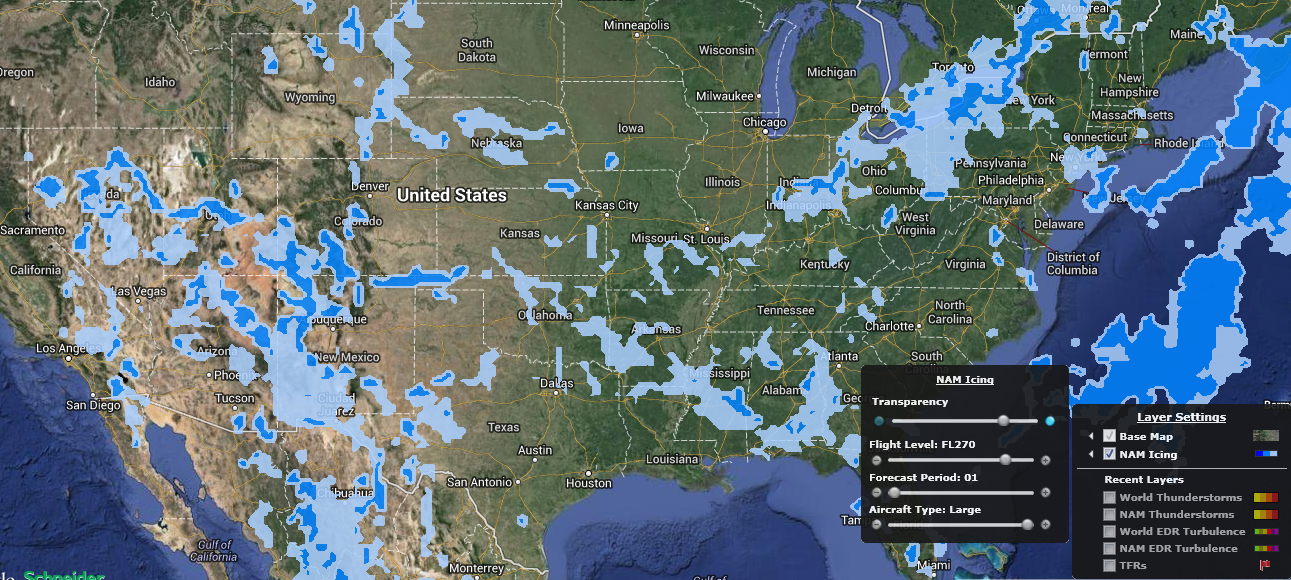 This layer provides the users with high definition forecast Icing for multiple flight levels as well as forecast periods over all of North America. There are specific forecast for Small, Medium and Large Aircrafts
