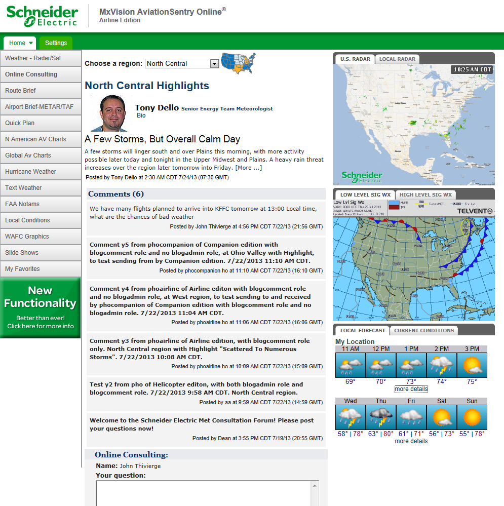 In all Platinum Edition of AviationSentry Online 7.4 there is a new feature called “Online Consulting” that allows users to ask questions directly to our meteorologists via a blog interface. There are weather outlooks updated twice a day by degreed mets for 7 geographical US regions. In the right section of the screen we also provide quick access to weather charts and maps relevant to Aviation as well to the user location. You can post a question in the "Online Consulting" box at the bottom of the screen and you will get a response within 15 minutes from one of our Aviation Meteorologists. Please also note that your questions as well all other aviation users will be displayed here for all to see.