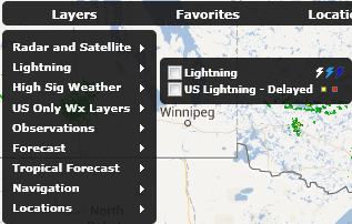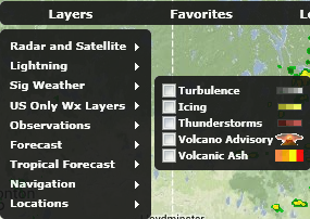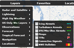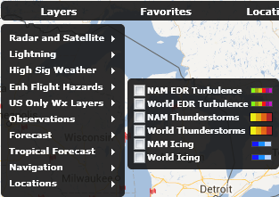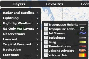 This top level menu has been reorganized in order to help users find what they are looking for more quickly and intuitively. There are now multiple sub-menu items that contain logical groupings of weather layers. We will look at the contents of each of the sub-menus below.