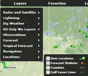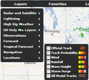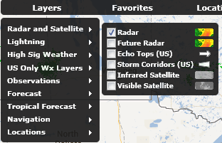 This sub-menu contains all relevant layers allowing users to quickly identify storms or approaching storms. It contains Radar, Future Radar, US Only Echo Tops and Storm Corridors, Infrared and Visible Satellite