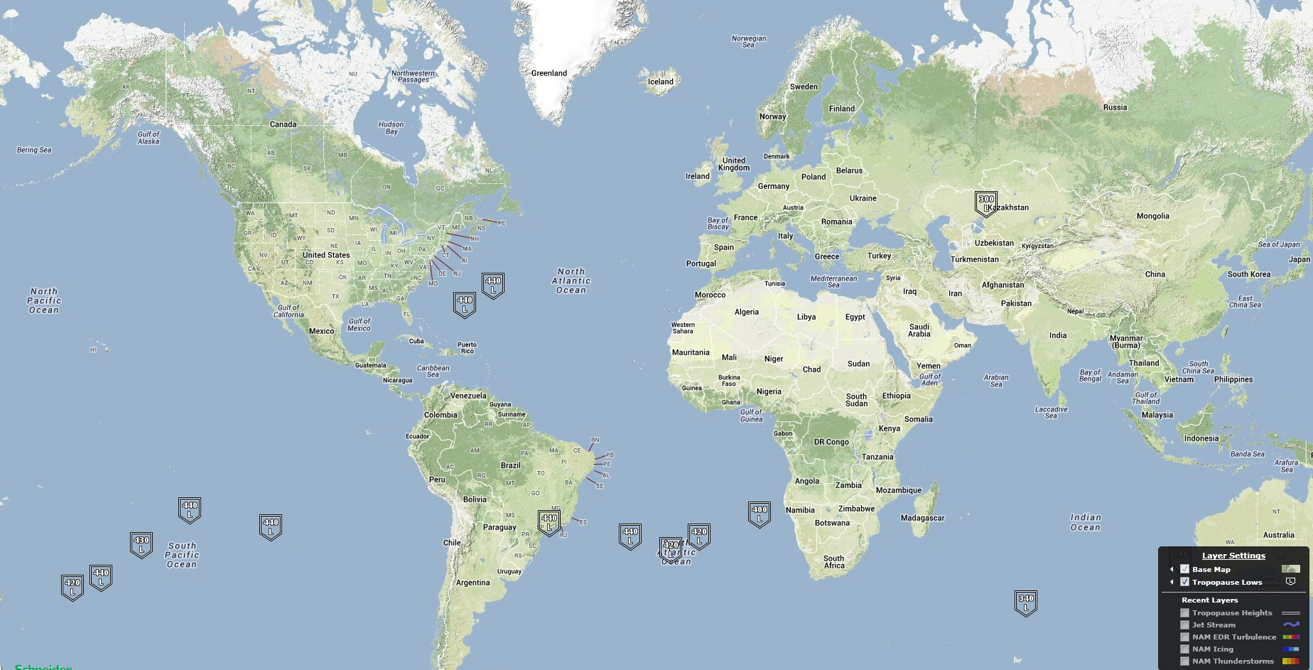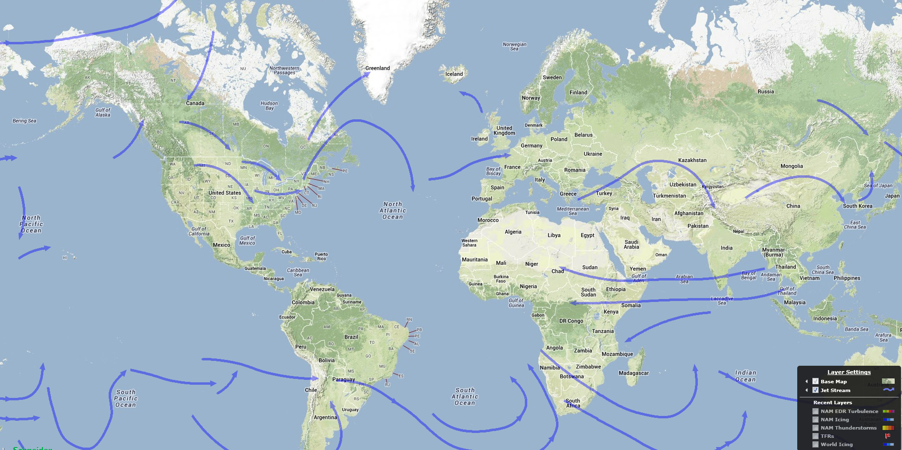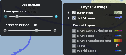 This layer shows the forecasted Jet Streams on a global scale and for 4 forecast periods (6, 12, 18 and 24 hours out). The different forecast periods are available via a slider bar in the layer options as depicted below