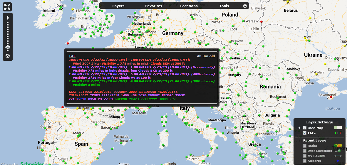 This layer depicts both graphically and color coded TAF conditions for all locations available on a global basis. The color shown on the map indicates the Flight Category of the first TAF period. The users can hover over any TAF and get a detailed TAF for the location with all TAF periods colorized to the appropriate flight category.