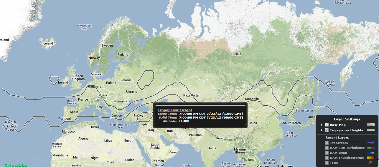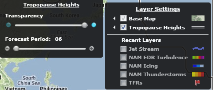 This layer shows the forecasted Tropopause Heights on a global scale and for 4 forecast periods (6, 12, 18 and 24 hours out). The different forecast periods are available via a slider bar in the layer options as depicted below