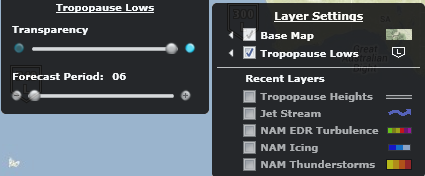This layer shows the forecasted Tropopause Lows on a global scale and for 4 forecast periods (6, 12, 18 and 24 hours out). The different forecast periods are available via a slider bar in the layer options as depicted below