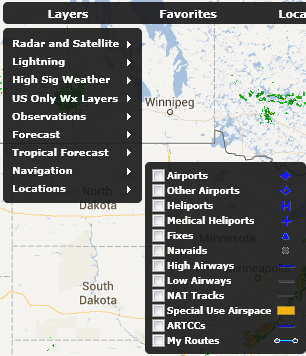 This sub-menu contains all of the High Sig Weather layers to allow users to quickly create dynamic map displays containing all required significant weather information to help determine impacts on upcoming flights. Please note that we will be adding very shortly Pressure Centers and Fronts to this menu once available