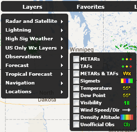 This sub-menu contains current weather observation layers only with the exception of the TAF layer. The TAF layer has been grouped in this category to be with the METAR layer to allow users to find these layers together. We have also added the Density Altitude layer to all non-helicopter editions.